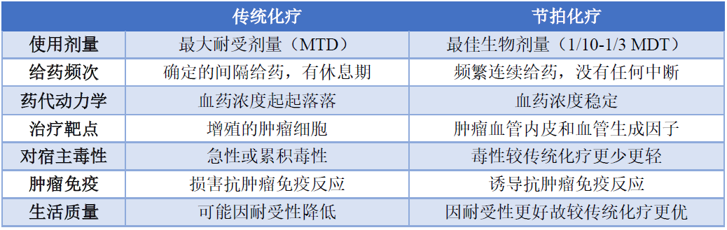 在这两项开创性研究基础上,Hanahan教授提出了节拍化疗的理念。节拍化疗是指高频度、规律地给予化疗药物,旨在长时间维持低但具有有效性且不增加额外毒性的药物浓度。节拍化疗与传统化疗不仅在给药模式上存在差异,在作用机制上二者也是截然不同的,传统化疗发挥抗肿瘤作用是直接破坏肿瘤DNA或者抑制DNA合成,而节拍化疗则是通过抑制肿瘤的血管生成或是刺激自体免疫功能来实现抗肿瘤作用。
