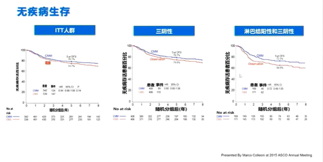王树森教授提到,早期乳腺癌中可以见到节拍化疗的身影。IBCSG 22-00是首个在早期乳腺癌中应用CM进行节拍化疗的临床试验,入组患者为HR-患者,在标准治疗结束后,一组患者采用CM进行节拍化疗维持,另一组患者随诊观察。结果显示,ITT人群5年DFS提高了3.4%,对于淋巴结阳性的高危患者5年DFS有7.9%的提升。