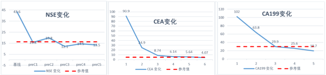 该病例为84岁高龄患者,肿瘤负荷大,根据CSCO指南,一线治疗方案采用减量化疗联合免疫。患者治疗2周期后体力状况明显改善,疗效评估达PR;4周期后肿瘤标志物接近正常值,疗效显著,且治疗过程中未出现明显的irAE,安全性良好;5周期后为防止肿瘤复发压迫器官联合局部放疗,未出现明显不良反应。该病例提示,对于高龄、因肿瘤引起PS评分差者,临床诊疗过程中需要积极治疗,但应在治疗过程中对化疗药物、免疫检查点抑制剂的剂量选择进行适当的调整,从而能够使患者在获得较好疗效的同时,安全性得到保障。