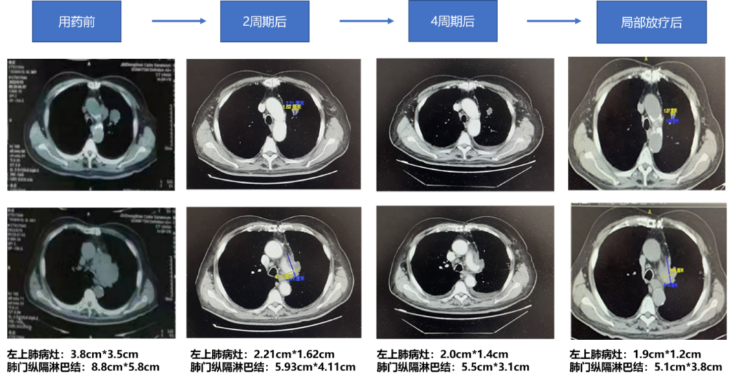 2022-09-27(4周期后)胸部CT:左肺上叶分叶状结节,较前稍缩小,现约1.42*2.0cm;左肺门稍肿大淋巴结,较前稍饱满,现约2.71*1.92cm。纵隔多发大小不等淋巴结,部分有融合,形成不规则软组织肿块,包绕临近血管,较大一处现约5.54*3.12cm,前约5.93*4.11cm,较前稍缩小。双侧锁骨上小淋巴结,变化不大。两肺肺气肿、肺大泡,两肺散在斑片索条影,胸膜下为主,呈间质性改变,较前明显;两肺散在小结节影,较大一枚仍0.78cm,变化不大。两侧胸腔少量积液,较前稍增多。