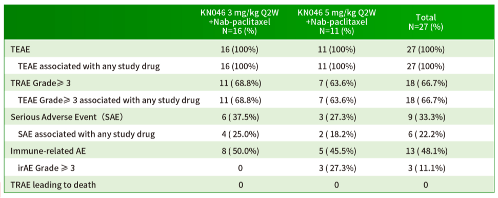 研究结果表明,KN046耐受性良好;KN046联合白蛋白结合型紫杉醇对晚期三阴乳腺癌患者有效,无论患者的PD-L1是否阳性,都显示出无进展生存期(PFS)和总生存期(OS)获益。
