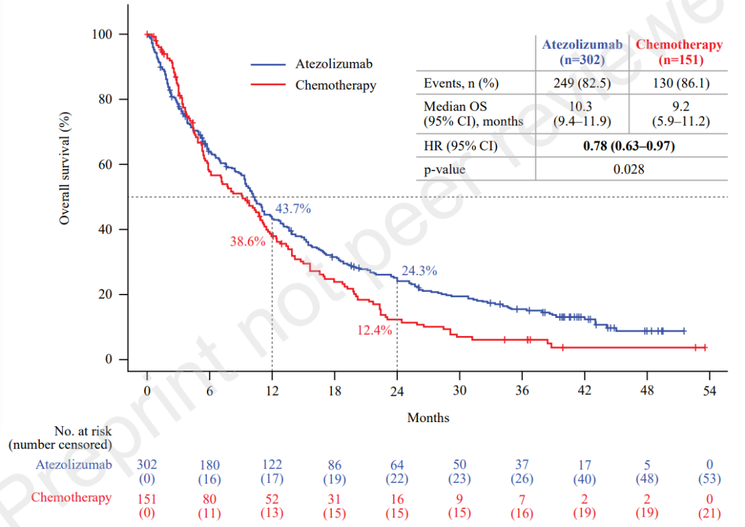 • 阿替利珠单抗组的中位总生存期为10.3个月,而化疗组为9.2个月(风险比<hr/>=0.78;P=0.028)。