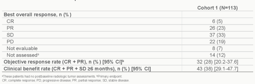 至数据截止时,中心审查的客观缓解率(ORR)为28%(95%CI:20.2~37.6);CBR为38%(95%CI:29.1~47.7)(图2),与此前报道的数据基本一致。