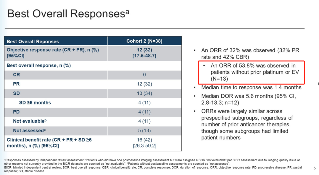 在不适用含铂化疗且既往接受过CPI治疗发生进展的患者中,SG单药治疗具有较高的缓解率,且总体安全可控。这些数据支持进一步评估SG用于既往接受过CPI治疗发生进展的mUC患者。