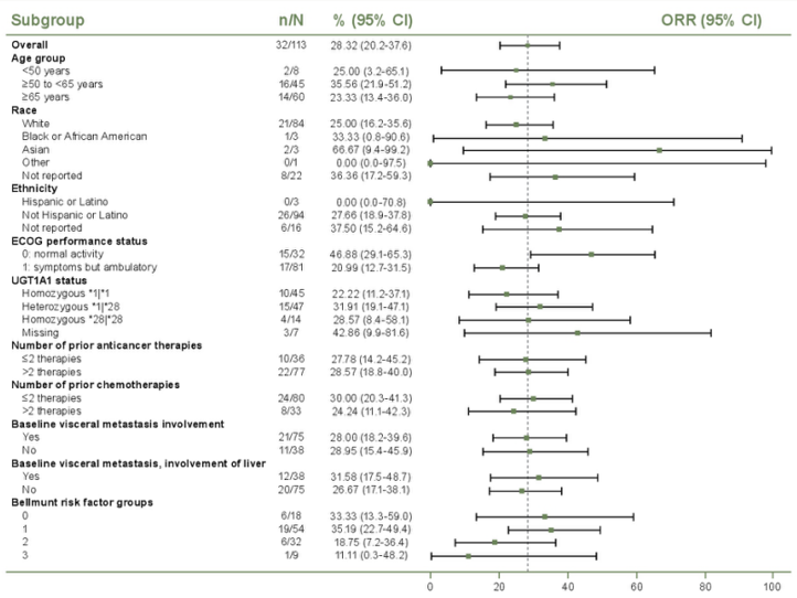 中位随访10.5个月,对于经过多线治疗的mUC患者,包括内脏转移、既往EV治疗和既往铂类(新)辅助治疗的患者,SG治疗仍然有较高的缓解率且未观察到新的安全信号。这些数据支持在接受过铂类和CPI治疗的mUC患者中使用SG,并支持进一步评估在前线治疗中使用SG。
