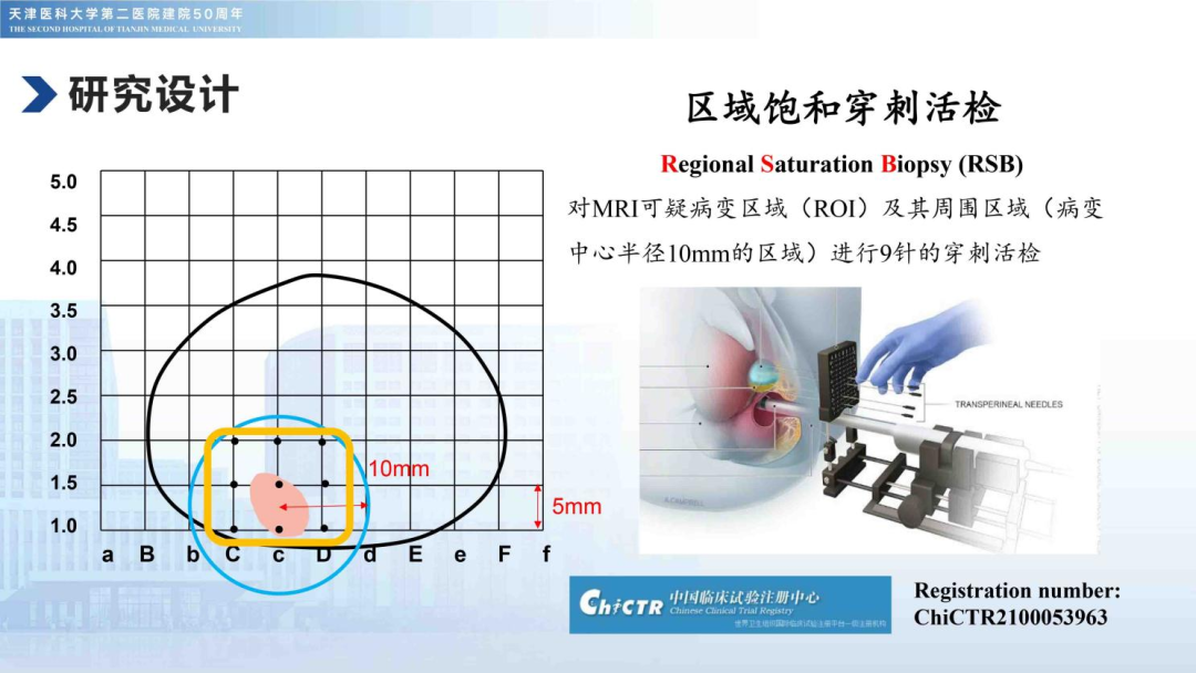 基于以上靶向穿刺和系统穿刺活检的优势,项目组提出了一种新的穿刺诊断理念“区域饱和穿刺活检(Regional Saturation Biopsy。RSB)”模式。该模式主要是基于mpMRI影像对前列腺可疑区域(即ROI以及周围1cm的可疑区域)进行精准的术前定位和规划,随后仅针对该可疑区域进行B超引导下饱和穿刺活检(9针),以期提高前列腺穿刺的准确性、降低穿刺相关并发症、减少麻醉时间以及提高患者满意度。基于上述理念,我们设计并制作了相关穿刺模板和支架,成功开展了“区域饱和穿刺和融合靶向穿刺活检对于PI-RADS≥3的可疑前列腺癌患者的前瞻、随机临床对照试验(中国临床试验注册号:ChiCTR2100053963)。研究结果发现:区域饱和穿刺活检在总体前列腺癌以及临床有意义前列腺癌的检出率方面显著优于靶向穿刺活检,特别是对于PI-RADS 3分、ROI≤0.5cm2以及病理神经侵犯等方面。