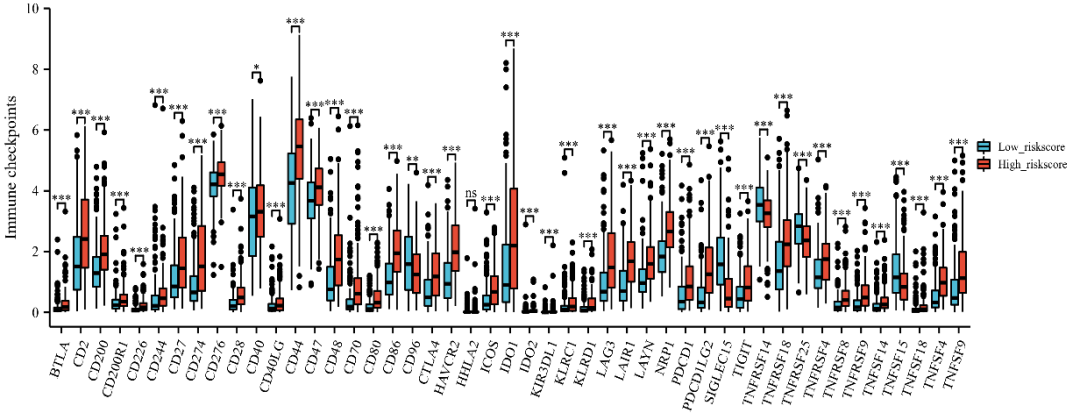 同时,高MRLS组与CD274、CD40、CTLA4、PDCD1、PDCD1LG2等多项免疫检查点呈正相关。在免疫细胞浸润中,高危评分样本与CD4+T 272记忆激活细胞、Tγδ细胞、巨噬细胞M0细胞、巨噬细胞M1细胞、巨噬细胞M2细胞和中性粒细胞浸润呈正相关(图4)。