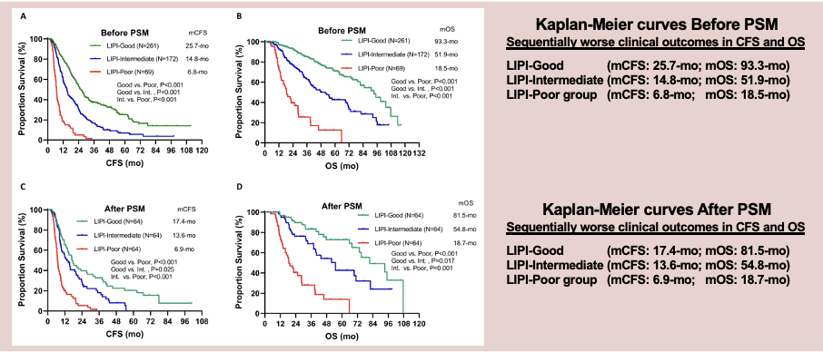 这项研究的结果显示:在转移性激素敏感性前列腺癌中,LIPI好、中以及差三组患者的无去势抵抗性前列腺癌生存期(CFS)和总生存期(OS)逐渐缩短;而对于接受阿比特龙一线治疗的去势抵抗性前列腺癌患者,LIPI分组同样显示出了预后的差异,LIPI好、中以及差三组患者的前列腺特异性抗原(PSA)反应率、无PSA进展时间以及总生存期都呈现出逐步递减的趋势。总结结果,LIPI对于转移性激素敏感性和去势抵抗性前列腺癌都具有很好的预后价值。