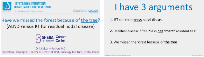 Orit Kaidar-Perso教授的题目是“不要因为一棵树错过整片森林”,主要提出三个论点:(1)放疗可以治疗结节性疾病;(2)初次全身治疗后残留的疾病对放疗没有更多的抵抗力;(3)不要因为一棵树而错过整片森林。