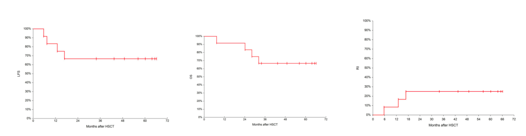 结果显示,患者中最常见的不良事件是血细胞减少。患者6个月的累积复发率(RI)为8.3%(95%CI:1.3%-54.4%),1年、2年和5年的RI分别为16.7%(95%CI:4.7%-59.1%)、25%(95%CI:9.4%-66.6%)和25%(95%CI:9.4%-66.6%);所有患者的2年总生存率(OS)为83.3%(95%CI:58.2%-98.1%),5年的OS为66.7%(95%CI:38.8%-89.3%);移植后两年复发率进入平台期。2年和5年的无白血病生存率(LFS)为66.7%(95%CI:38.8-89.3%),见图1。