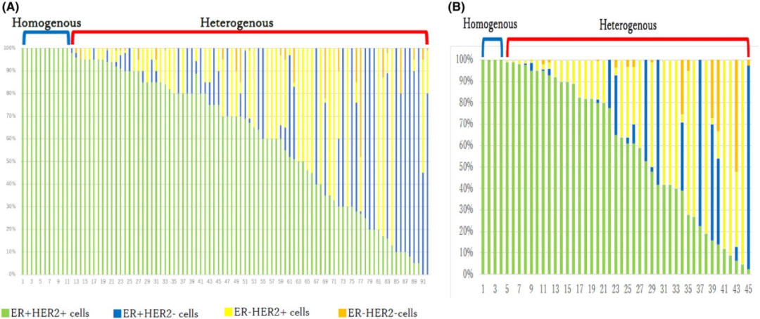 瘤内异质性(即同一肿瘤内组织学存在空间和时间上的差异)可导致治疗耐药性产生。使用下一代测序对癌症进行全面基因组分析表明,癌症具有基因型和多样性表型的异质性。ER+/HER2+乳腺癌含有的ER+和HER2+癌细胞比例可能不同,导致了瘤内异质性产生。这项研究通过ER和HER2双染色对单个细胞进行计数来评估瘤内异质性情况。