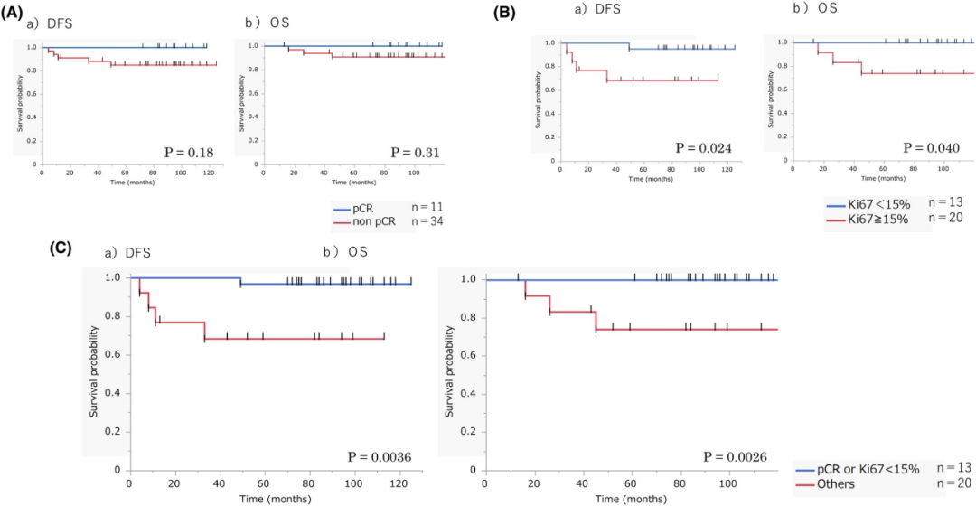 在队列B中,治疗后Ki67(而非pCR)是DFS和OS的预后因素(P=0.028,P=0.017)。治疗后Ki67和pCR的联合预后价值优于其中任何一种。pCR和Ki67的联合预后价值对DFS和OS均独立(P=0.0068,P=0.0101)。