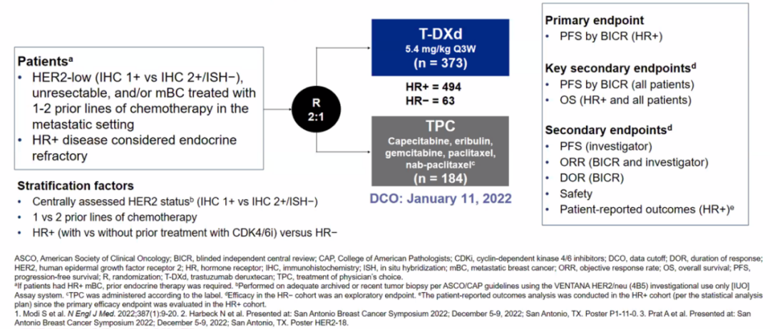 DESTINY-Breast04是全球首个针对HER2低表达乳腺癌患者进行的随机对照、Ⅲ期研究,纳入了既往接受过1-2线化疗的HER2低表达(IHC 1+或IHC 2+/ISH−)转移性乳腺癌(mBC)患者人群(HR+乳腺癌患者494例和HR-乳腺癌患者63例),其中HR-约占整体人群的10%(与流行病学数据一致),比较了T-DXd(5.4mg/kg)与医生选择的化疗(TPC:卡培他滨、艾立布林、吉西他滨、紫杉醇或白蛋白结合型紫杉醇)的疗效与安全性。