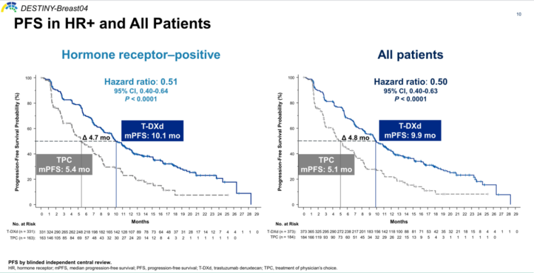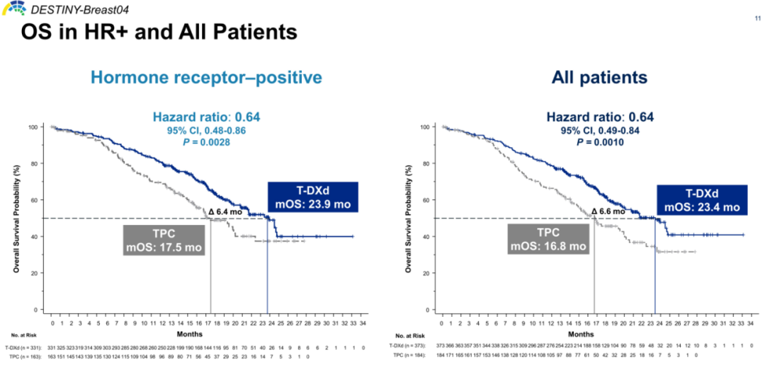 图3.DESTINY-Breast04研究HR+和总人群的PFS和OS