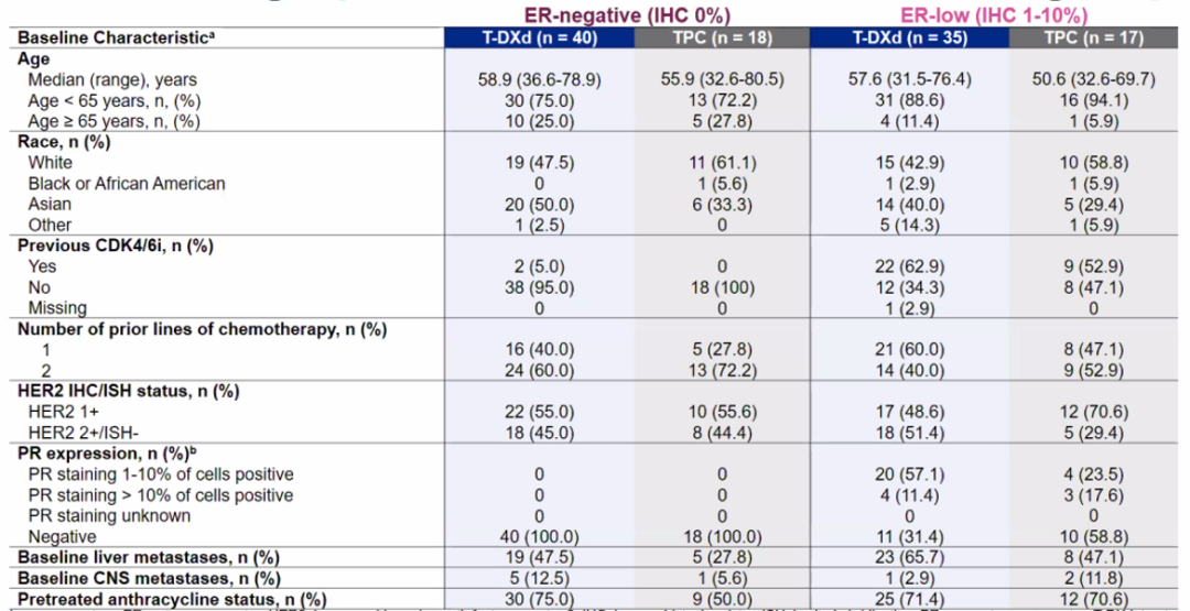 亚组分析共纳入110例患者(ER IHC 0%n=58;ER IHC 1~10%n=52)。基线特征见下表。