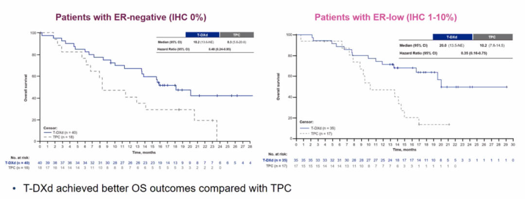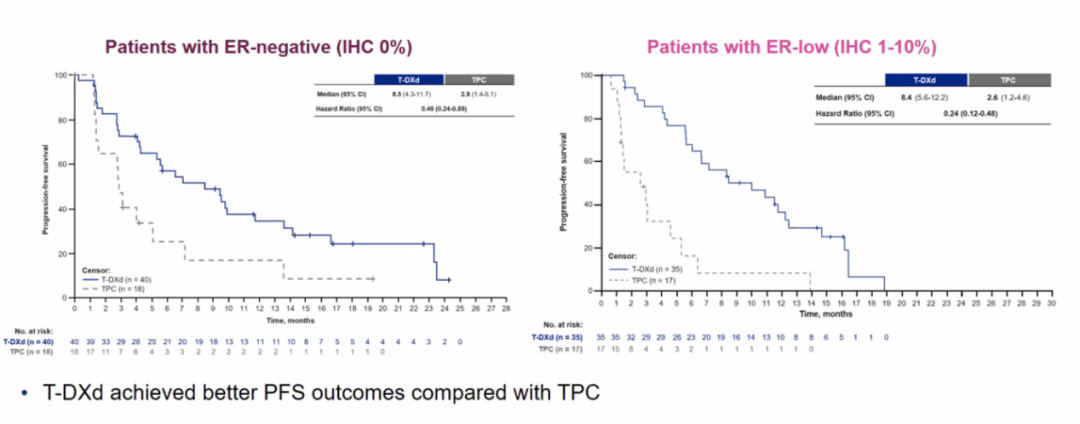 亚组分析结果显示,无论患者ER状态如何,相较于TPC组,T-DXd组均有更好的PFS、OS和ORR结果。与TPC相比,接受T-DXd治疗的ER IHC 1~10%的患者均有良好的获益。