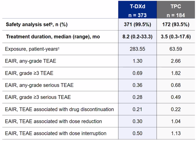 2023年ESMO BC大会上,美国加利福尼亚大学旧金山分校海伦迪勒家庭综合癌症中心Hope S.Rugo教授对DESTINY-Breast04研究的安全性结果(185O)进行了介绍。数据截止日期为2022年1月11日,T-DXd组患者中位治疗持续时间为8.2个月(范围:0.2~33.3),TPC组中位治疗持续时间为3.5个月(范围:0.3~17.6)。研究者测定了暴露调整发病率(EAIRs)以解释T-DXd和T-DM1不同暴露条件下治疗持续时间的差异,并提供了更有意义的比较。结果显示,T-DXd组任何级别TEAE的EAIRs均低于TPC组(1.30 vs 2.66)。