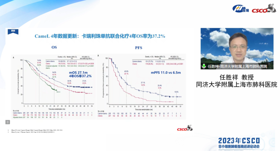 任胜祥教授解读了驱动基因阴性NSCLC的系统治疗更新要点。非鳞癌和鳞癌一线治疗Ⅰ级推荐阵列进一步壮大。同时,既往已成为Ⅰ级推荐方案的多项研究在2022年更新了数据。其中CameL研究公布了4年长生存数据,卡瑞利珠单抗联合化疗一线治疗驱动基因阴性非鳞状NSCLC,3年OS率达到39.3%,4年OS率高达37.2%,使超1/3患者生存突破4年。4年生存率相较3年,仅下降了2%,提示这些患者很有可能生存突破5年,那么随着随访时间的延长,相信卡瑞利珠单抗将进一步提高晚期患者5年生存率,让更多患者实现长期无病生存!中位OS和无进展生存期(PFS)相较对照组均取得显著延长,分别达27.1个月和11.0个月、两者均创下了当前同类Ⅲ期研究中的最长纪录。CameL-sq研究也更新了OS数据,卡瑞利珠单抗联合化疗一线治疗驱动基因阴性鳞状NSCLC的3年OS率达42.8%,中位OS达27.4个月,也是同类Ⅲ期研究中最长。尽管不同研究间无法直接比较,但足见卡瑞利珠单抗联合方案的卓越疗效。
