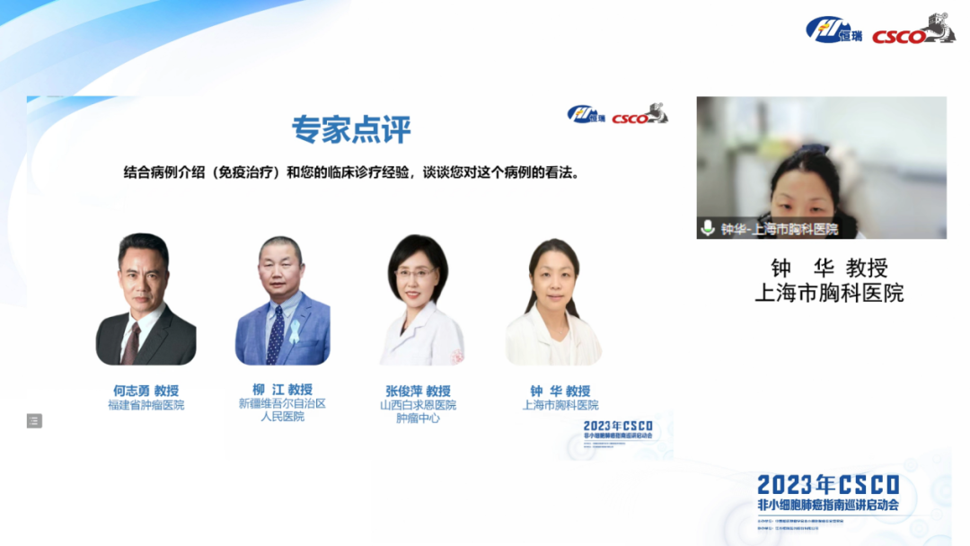 点评环节中,福建省肿瘤医院何志勇教授、新疆人民医院柳江教授、山西白求恩医院张俊萍教授和上海市胸科医院钟华教授发表了观点。专家谈到,免疫治疗不仅改写了指南,更是切切实实改变了很多患者的生命轨迹;此例患者通过卡瑞利珠单抗联合化疗一线及维持治疗获得了超长PFS,已经步入慢病化管理;关于免疫维持治疗的时长和给药间隔时间仍然需要临床实践数据支持,目前主要根据药物可及性、患者耐受性等个体化决策。