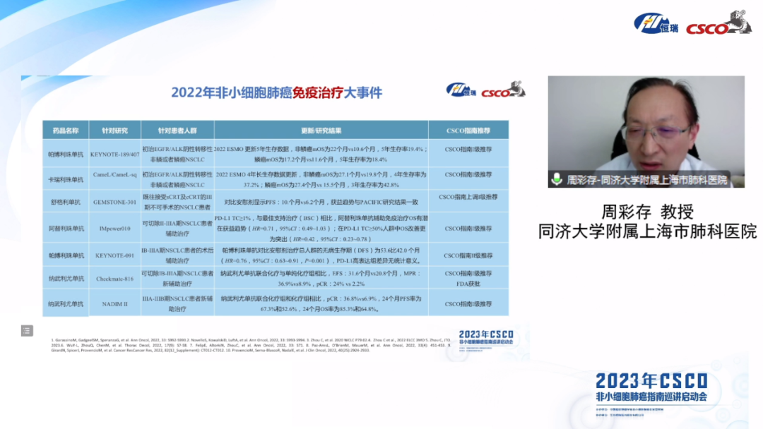 致辞环节后,周彩存教授介绍了2022年NSCLC领域的大事件,并解读了CSCO指南的临床指导意义。免疫治疗将晚期肺癌患者带到了长生存时代,评价免疫治疗的疗效,OS获益至关重要。免疫治疗逐渐由晚期拓展至围术期治疗,探索不断前移,靶向治疗的锋芒已由常见靶点覆盖至少见靶点,抗体药物偶联物(ADC)也即将走进NSCLC治疗。CSCO指南放眼全球、立足中国,基于证据、兼顾可及,形成了更适合中国患者的行业规范。
