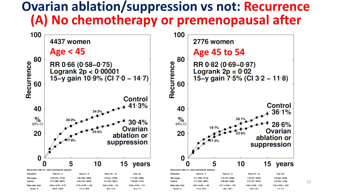 图3:未化疗或化疗后未绝经患者不同年龄卵巢切除/抑制vs未切除/抑制的复发状况