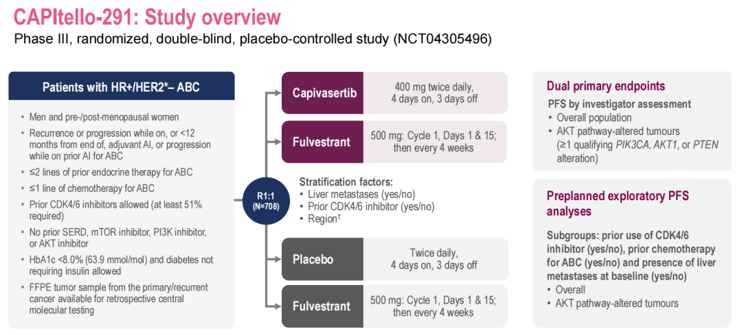 Giuseppe Curigliano教授:Capivasertib是一种强效、选择性泛AKT抑制剂。CAPItello-291研究是一项随机、双盲、安慰剂对照Ⅲ期临床研究(NCT04305496),旨在评估AI耐药的HR+/HER2-晚期乳腺癌患者接受Capivasertib+氟维司群(C+F)的疗效与安全性。主要终点是意向性治疗人群和AKT信号通路改变患者的PFS获益。