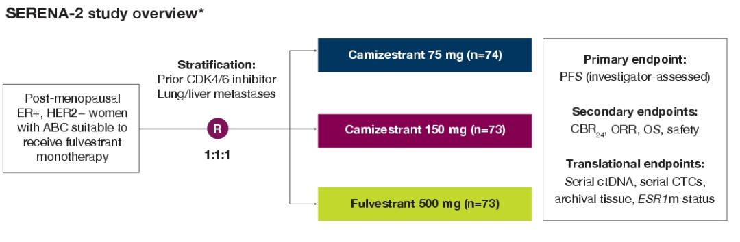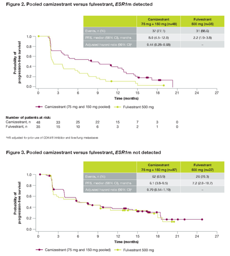 Camizestrant是另一种口服SERD药物,SERENA-2研究将75 mg和150 mg的Camizestrant与标准剂量的氟维司群进行比较,研究结果显示,在总体人群中,与氟维司群相比,Camizestrant在PFS方面显示出统计学上显著和有临床意义的获益。本届ASCO大会报道了SERENA-2试验的探索性分析(摘要号:1066),数据分析显示,Camizestrant相较于氟维司群在基线和ESR1m可检测到的患者中均有PFS改善。