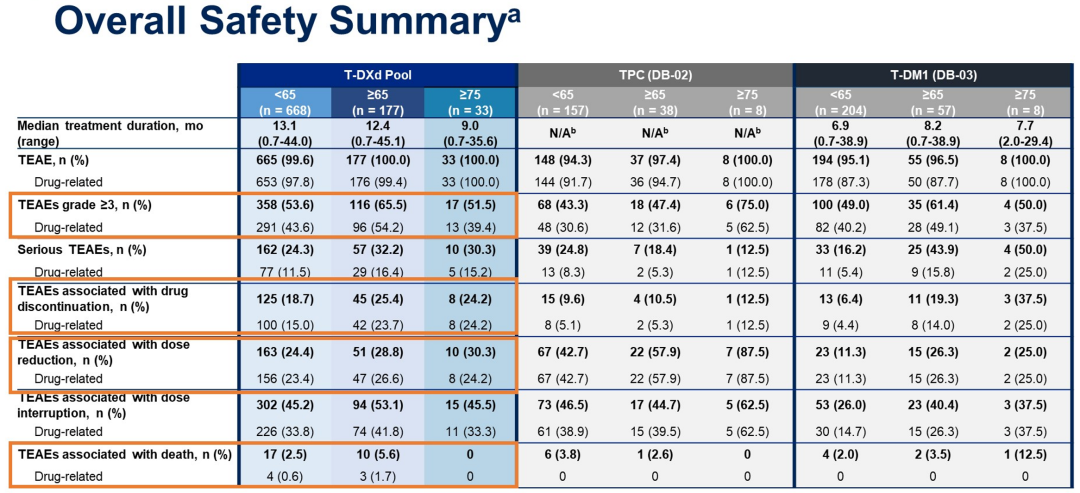 我们知道,欧美国家的乳腺癌中位发病年龄大约为63岁,老年患者非常多;而我国的人口基数大,也有不少年龄偏大的患者。老年患者对抗肿瘤治疗的耐受性总体上要差一些,新型药物在这部分人群中的疗效和安全性一直是大家比较关心的话题。这次ASCO大会报道的这项DB-01、02、03研究的汇总分析,对分析此类人群而言非常有价值。因为DESTINY-Breast系列正在向晚期一线、早期(新)辅助治疗拓展,这些特殊人群的数据对其他研究也会有很好的启示。