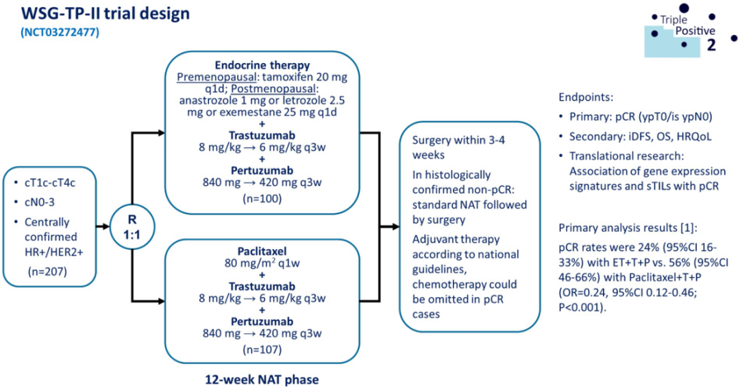 研究背景:三阳性乳腺癌(HR+、HER2+,triple positive breast cancer,TPBC)大约占所有乳腺癌的10%。其肿瘤细胞的生物学行为及对治疗的反应不同于单纯HER2阳性或ER阳性者,存在着很大的异质性。对于TPBC人群的治疗方针目前悬而未决的问题包括:1.缺乏特别针对TPBC人群开展的临床研究,因此现有的治疗模式通常是参考HER2+伴HR+亚组人群制定的;2.ER通路与HER2通路的交互作用是否对抑制两通路靶向药物疗效存在干扰;3.TPBC中是否存在通过靶向HER2和ER的药物而无需化疗即可达到治愈的人群,其生物标记物是什么。