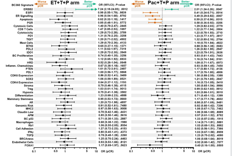 研究方法:207例经中心确认的早期TPBC患者(cT1-cT4,cN0-3)被随机分成两组,分别接受12周标准内分泌治疗或紫杉醇80mg/m2周疗方案,两组均同时接受曲妥珠单抗+帕妥珠单抗的双靶治疗方案(TP+ET,100例,TP+wPac,107例)。使用NanoString BC360分析基线时穿刺活检组织中的基因表达(TP+ET,72例;TP+wPac,78例)。分别在基线(TP+ET,93例;TP+wPac,97例)和第3周时(TP+ET,65例;TP+wPac,57例)分析sTILs。用logistic回归分析法分析BC360基因表达特征和sTILs对pCR(ypT0/is、ypN0;主要终点)的优势比(odds ratio,OR)。