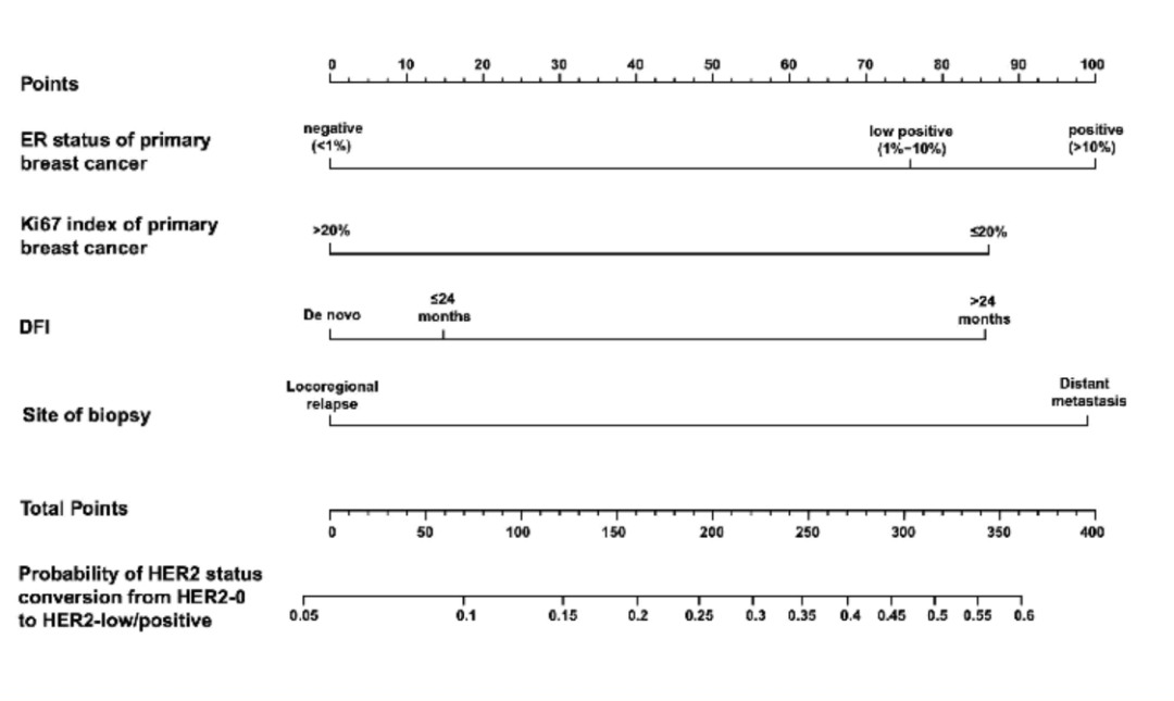 本研究还通过ER状态、Ki67指数、活检部位以及无疾病间隔时间建立了首个预测患者从HER2 IHC 0转化为HER2低表达或HER2阳性可能性的评估模型,为临床更精准地预测、检测HER2状态改变的患者提供了指导方向。