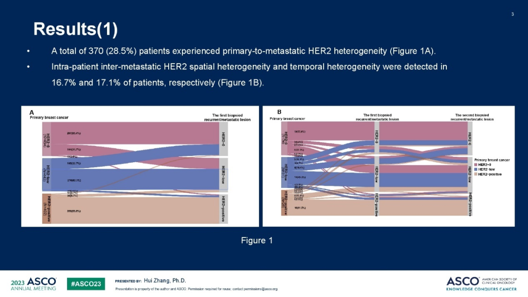 复旦大学附属肿瘤医院张剑教授在本次ASCO带来的HEROD-BC研究分析了我国乳腺癌患者HER2状态转化的数据[5]。该研究纳入了复旦大学附属肿瘤医院和四川大学华西医院1299例可评估HER2状态的原发性及复发/转移性的乳腺癌患者。共有370例(28.5%)患者在疾病复发时发生了HER2状态的转变,其中144例患者(31.7%)从HER2-0转化为HER2低表达,并还观察到HER2状态在转移灶内的异质性。
