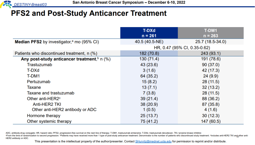 DESTINY-Breast 03研究PFS2(定义为从随机化至患者第二次出现疾病进展)的结果[3]为此提供了有力的参考。在T-DXd经治进展后,71.4%(n=130)患者接受了后续治疗,其中约50%(64/130)的患者选择T-DM1,约30%(38/130)患者选择抗HER2 TKI方案。结果显示,T-DXd组PFS2达到了40.5个月,显著优于对照组25.7个月。显而易见,该结果提示T-DXd经治后的抗HER2治疗的有效的治疗策略,TKI可以作为选择之一。