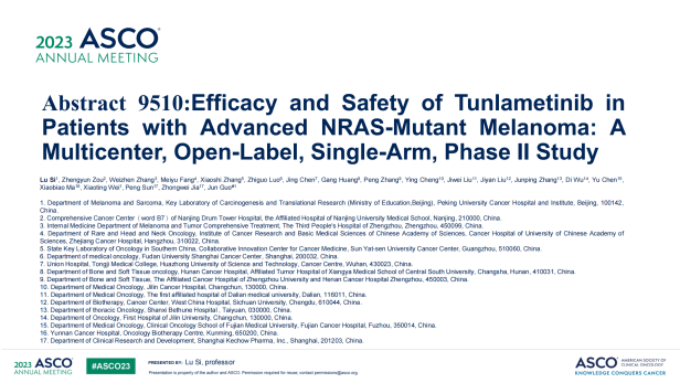 [3]Lu Si,Zhengyun Zou,Weizhen Zhang,et al.Efficacy and safety of tunlametinib in patients with advanced NRAS-mutant melanoma:A multicenter,open-label,single-arm,phase 2 study.ASCO 2023;Abstract 9510.