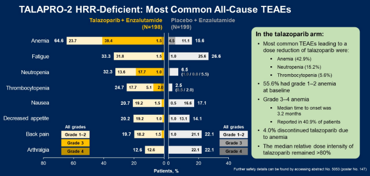 当然,我们也需要注意联合治疗带来的安全性和耐受性问题,这项研究中TALA+ENZA的3-4级治疗期间不良事件(TEAEs)发生率(66.2%vs 37.2%)和治疗中断率(67.2%vs 19.6%)均有所增加。贫血是最为常见的TEAE,有将近40%的患者发生≥3级贫血事件。因此,临床实践中要注意监测患者的贫血情况,及时做好预防和处理。