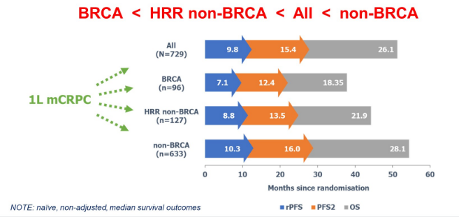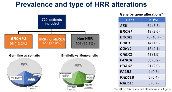 首先是BRCAm、HRRm的发生频率是多少。在mCRPC患者中,HRRm的发生率大约为30%,其中BRCA1/2突变、BRCA以外的HRRm分别占13.2%和17.4%。