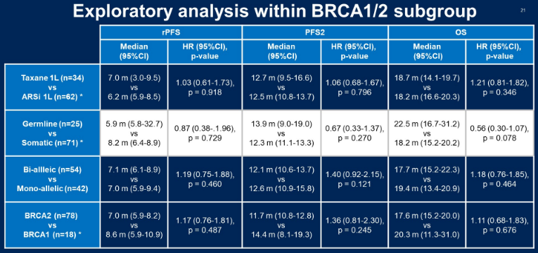 另外需要注意的是,这项研究的探索性分析显示,胚系和体系BRCA突变患者的生存获益并没有显著差异,所以在临床检测时,这两种突变类型都应该考虑。对于存在BRCA突变的患者,我们需要采取更加积极的药物来控制癌症。