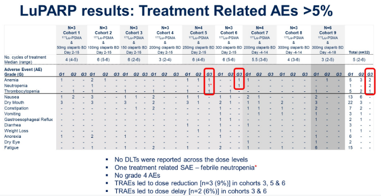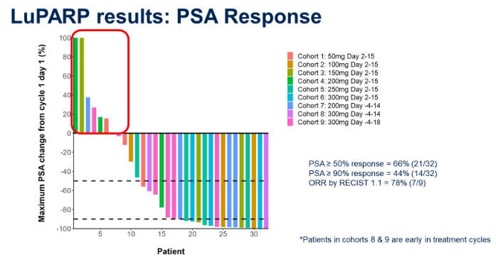 这是一项剂量递增的1期研究,我们更关注联合治疗的不良反应、剂量限制毒性(DLT)。研究结果显示,不同剂量奥拉帕利联合177Lu-PSMA-617整体上安全性良好,没有发生DLT。更长远的癌症控制数据还没有,但从PSA-RR(66%)、PSA90缓解率(44%)、ORR(78%)等短期疗效数据来看,还是非常不错的,PSA下降幅度比较大。