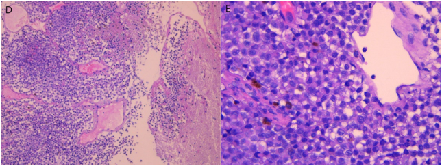 图D-E.软脑膜组织活检病理(D:HE×100;E:HE×400)