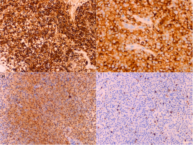 F:HMB45显示肿瘤细胞弥漫阳性;G:MelanA显示肿瘤细胞弥漫阳性;H:S-100显示肿瘤细胞弥漫性阳性;I:Ki-67显示中瘤细胞约5%阳性。