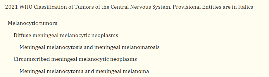[2]Küsters-Vandevelde HV,Küsters B,van Engen-van Grunsven AC,Groenen PJ,Wesseling P,Blokx WA.Primary melanocytic tumors of the central nervous system:a review with focus on molecular aspects.Brain Pathol.2015;25(2):209-226.doi:10.1111/bpa.12241