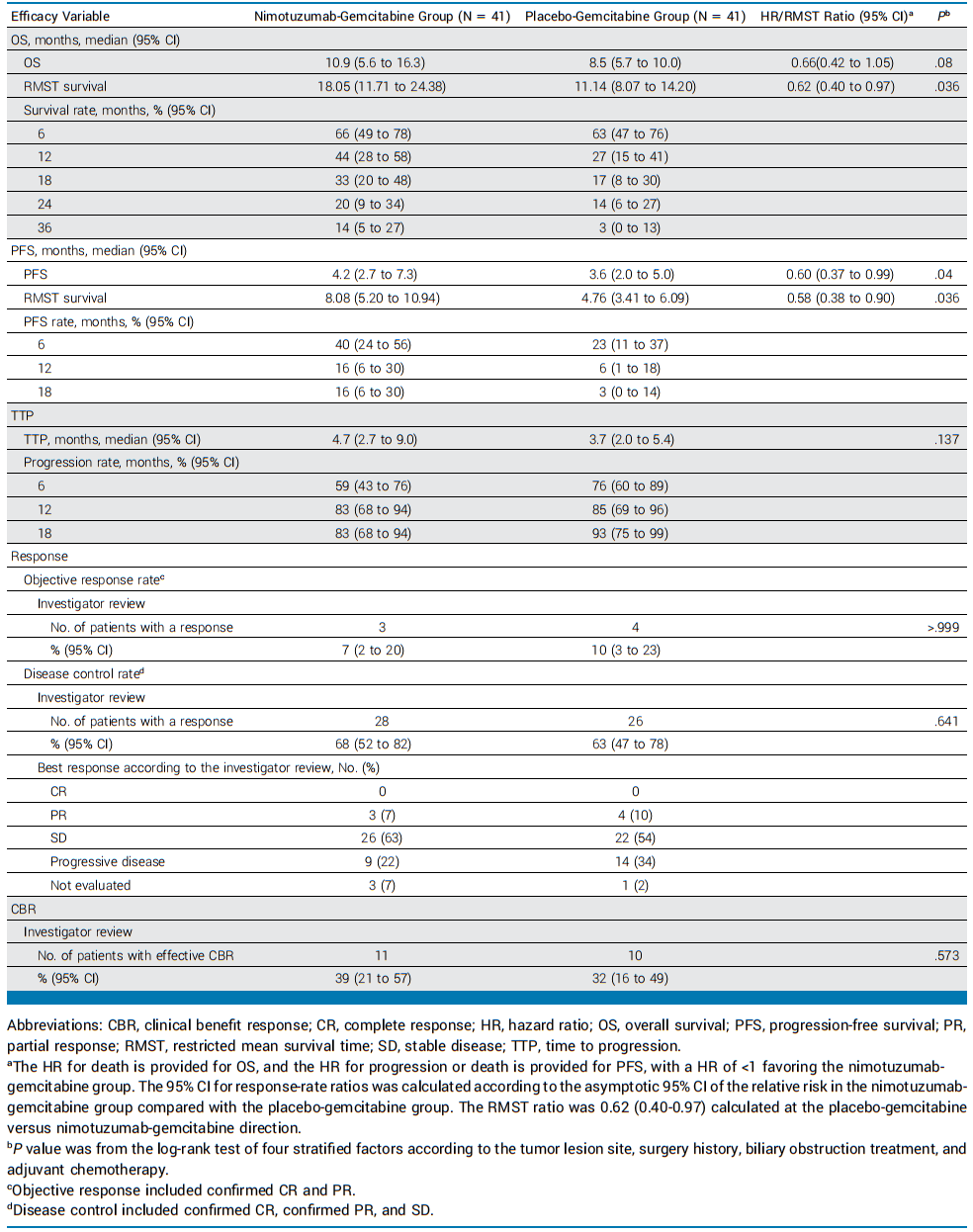 本研究中符合条件的患者被随机分配接受尼妥珠单抗(400 mg,每周一次)或安慰剂,随后接受吉西他滨(1000 mg/m2,第1、8和15天,4周一个疗程),直到疾病进展或不可接受的毒性。主要终点是总生存期(OS),次要终点是无进展生存期(PFS)、客观反应率(ORR)、疾病控制率(DCR)和安全性。