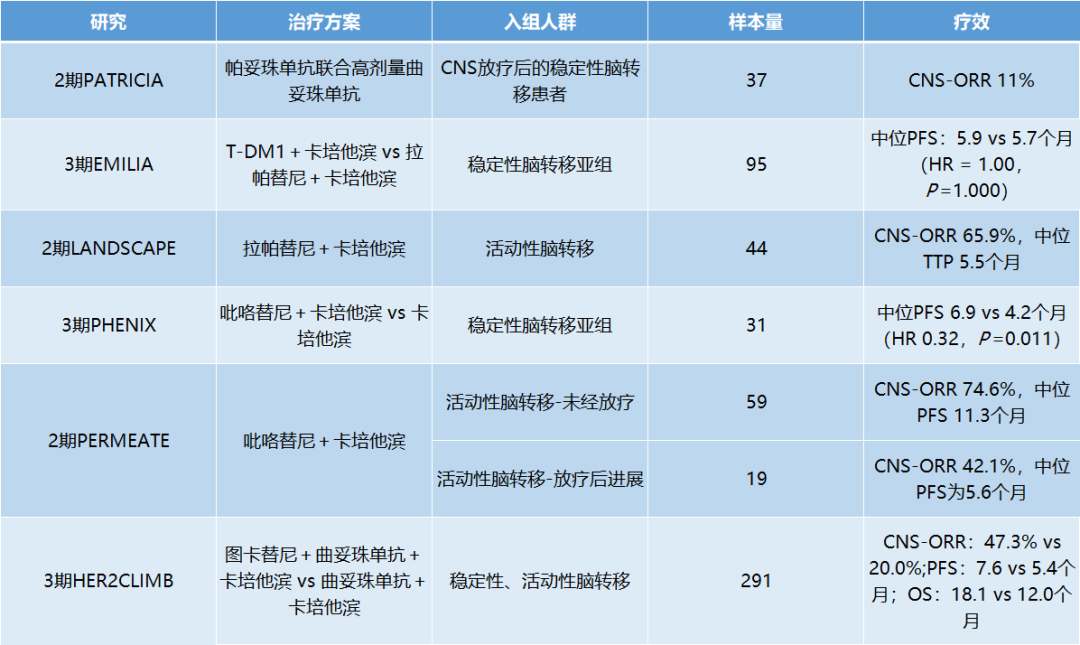 表1.既往大分子药物和小分子TKI对HER2阳性乳腺癌脑转移患者的疗效(非头对头比较,各研究入组患者有差异)