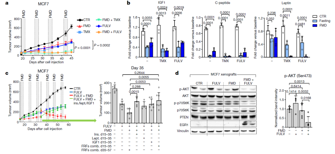 a)随意饮食(对照,CTR;n=6)、每周48小时FMD(n=6)、他莫昔芬(TMX;n=6)治疗的6-8周龄雌性BALB/c裸鼠接种MCF7细胞(n=6),氟维司群(FULV;n=8),或联合TMX+FMD(n=8)或FULV+FMD(n=10)。b)禁食或FMD(或随意饮食)联合或不联合TMX或FULV治疗的雌性6-8周龄BALB/c裸鼠血清IGF1、C肽和瘦素浓度的变化。在禁食或FMD结束时收集血清。c)6-8周龄雌性BALB/c裸鼠接种MCF7细胞;当肿瘤变得明显时,小鼠被随机分组接受随意饮食(n=6)、FULV(n=6)、FULV+每周FMD(n=6)、FULV+每周FMD加腹膜内胰岛素(ins.;n=5)或IGF1(n=5)或瘦素(lept.;n=5)或组合胰岛素+IGF1+瘦素(FRF组合;n=7)。第35天(交叉)时,撤回FRF给药,而在仅接受FULV+FMD的小鼠中开始给药。左图,MCF7肿瘤生长与不同饮食的关系。右图,第35天时不同处理反应的MCF7肿瘤体积。d)用MCF7细胞接种6-8周大的雌性BALB/c裸鼠。当肿瘤变得明显时,小鼠被随机分配接受随意饮食、FULV、48小时FMD或FULV+FMD治疗。在第四个FMD周期结束时杀死小鼠。左图通过免疫印迹法检测肿瘤中磷酸化(p-)(AKT的Ser473;p70S6K的Thr389)以及总AKT和p70S6K、EGR1、PTEN和黏着斑蛋白(在同一凝胶上)。右侧,p-AKT带被量化并标准化为总AKT(数据点是生物学重复)。