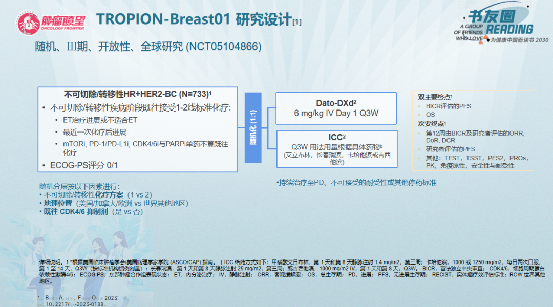 TROPION-Breast01是一项全球、随机、多中心、开放标签的Ⅲ期临床试验,旨在评估Dato-DXd对比研究者选择的单药化疗(TPC,艾立布林、卡培他滨、长春瑞滨或吉西他滨)用于HR阳性、HER2低表达或阴性(IHC 1+或IHC 2+/ISH-,IHC 0)不可手术或转移性乳腺癌患者的安全性和有效性。这些患者既往接受过内分泌治疗,且至少接受过一次全身治疗。该研究采用双主要研究终点设计,分别为BICR评估的PFS以及OS。关键次要终点包括ORR、研究者评估的PFS和安全性等。