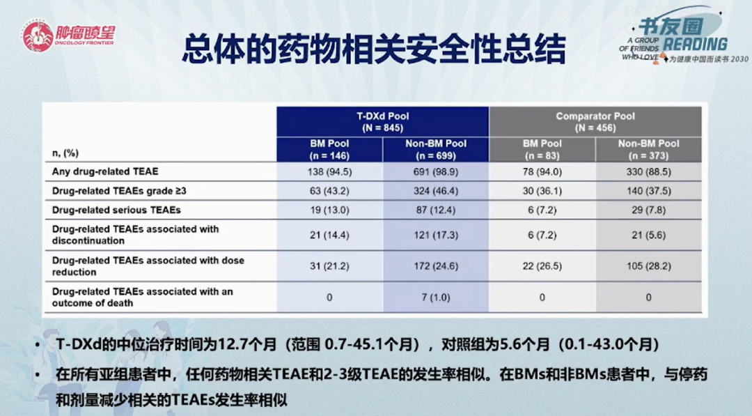 T-DXd组的中位治疗持续时间为12.7个月,对照组中位持续治疗时间为5.6个月。任何级别TEAEs和药物相关的≥3级TEAEs的发生率在所有亚组患者中相似;TEAEs导致的停药和剂量减少的发生率在脑转移和非脑转移亚组中相似。T-DXd组的任何级别TEAEs、药物相关的≥3级TEAEs和严重药物相关的AEs发生率分别为94.5%、43.2%和13.0%,而对照组分别为94.0%、36.1%和7.2%。