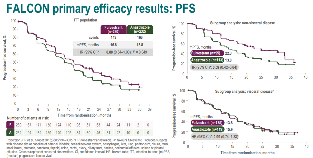在非内脏转移的患者中,氟维司群组与阿那曲唑组相比,死亡风险降低了15%,但二者未达到统计学差异。在有内脏转移的患者中,接受氟维司群和阿那曲唑治疗患者的OS相当。两组患者在生活质量方面没有看到明显的差异。没有出现新的安全信号。
