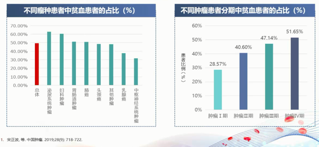 CRA属于低增生,正细胞性贫血,血清铁和转铁蛋白饱和度降低,而血清铁蛋白正常或升高。我国2019年数据显示,半数肿瘤患者存在贫血,其中泌尿系统肿瘤发生率最高,而中枢神经系统肿瘤发生率相对较低[2];并且,发病率随肿瘤进展而升高,肿瘤IV期的贫血患者比例甚至超过51%[2]。但国内和国外的贫血发生率略有差异,中国肿瘤患者化疗后的贫血发生率为78.8%,而国外则接近90%[2,3]。