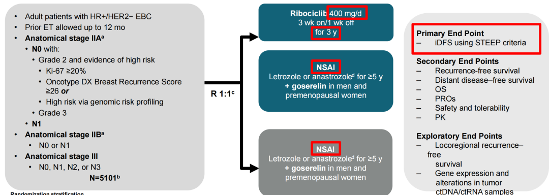 方法:研究入组了5101例绝经前/绝经后女性和男性患者,根据AJCC(第8版)分期为IIa期(具有额外危险因素的N0或N1)、IIb期或III期乳腺癌,随机(1:1)接受RIB(400 mg/天,服用3周/停用1周,共36个月)+NSAI(来曲唑2.5 mg/天或阿那曲唑1 mg/天,共≥60个月)或单独接受NSAI。男性和绝经前女性接受戈舍瑞林(每28天一次,每次3.6 mg)。无论是否停止RIB治疗,患者均继续接受NSAI治疗。主要终点是根据STEEP V1.0标准评估的iDFS,次要疗效终点为无复发生存期(RFS)、无远处疾病生存期(DDFS)和总生存期(OS)。计划在发生500例iDFS事件后进行最终分析。