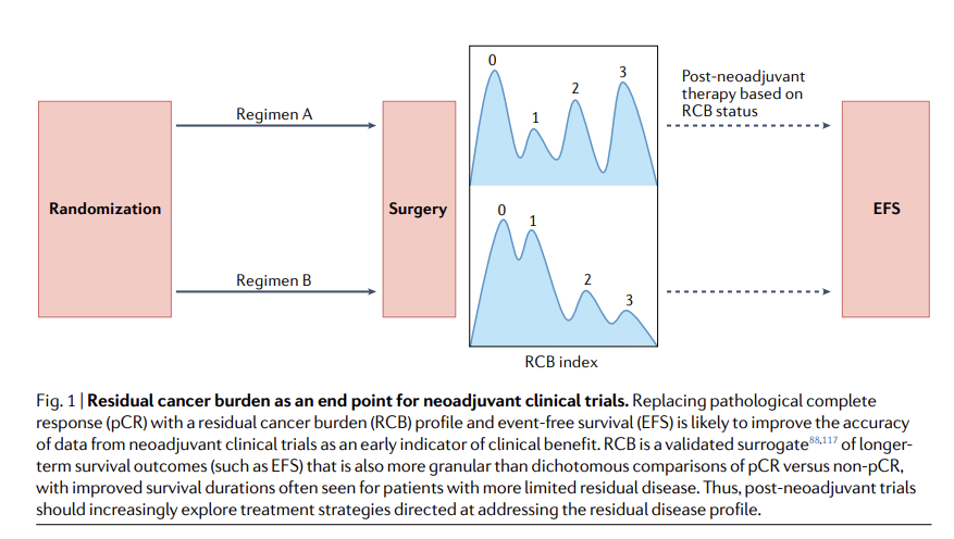 20世纪90年代初,为了最大化患者利益,满足重大疾病用药需求,在临床研究中使用替代终点加速审批的方式获得认可9。新辅助治疗的临床研究中pCR与OS仅呈弱相关,由于免疫治疗的超进展作用、HR+/HER2-新辅助内分泌治疗低pCR率的特点,pCR作为替代终点存在争议,但pCR引起了研究者对残留肿瘤负荷(RCB)的兴趣。RCB是基于原发肿瘤(直径和细胞比例)和淋巴结转移(数量和大小)的病理测量评估的连续指数可分为RCB 0(pCR)、RCB 1、RCB 2和RCB 3,其与乳腺癌各分子亚型长期预后的相关性已得到证明10。因此,RCB已越来越多的作为替代终点应用于早期乳腺癌患者的新辅助试验中。此外,FDA认为,DFS、EFS、客观缓解率(ORR)等也可考虑作为替代终点11